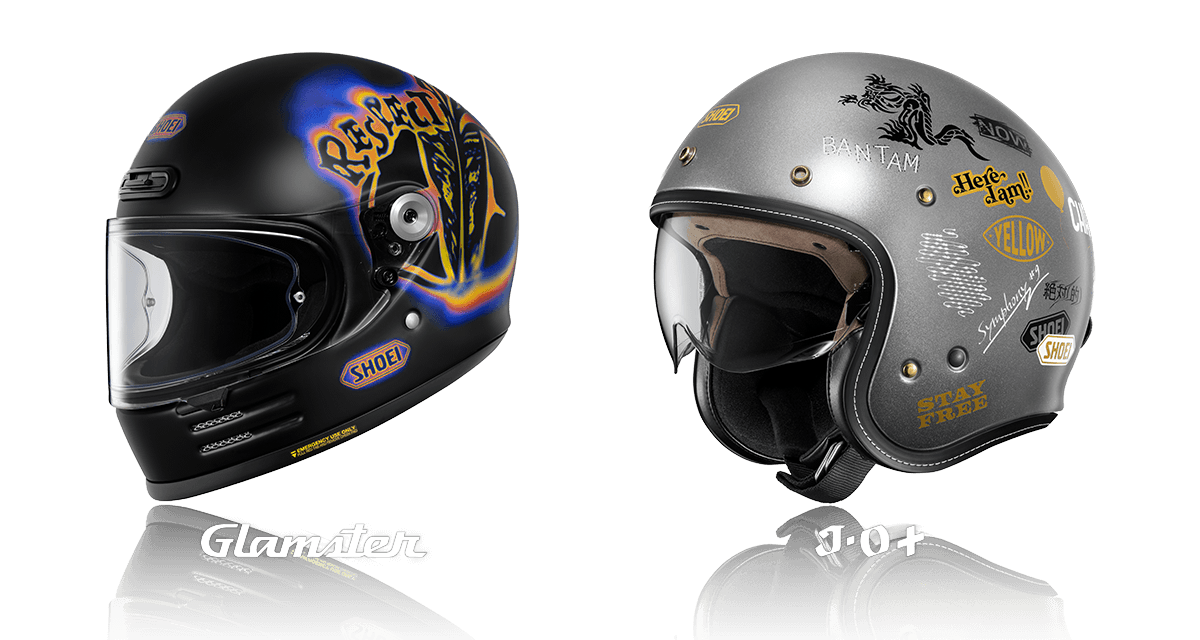 コラボレーションのベースとなるヘルメットは、クラシックスタイルと機能性を両立させたネオクラシックフルフェイスヘルメット「Glamster」(グラムスター) と、幅広いスタイリングでバイクライフに楽しさをプラスするジェットヘルメット「J・O+」(ジェイオー・プラス) の2種になります。